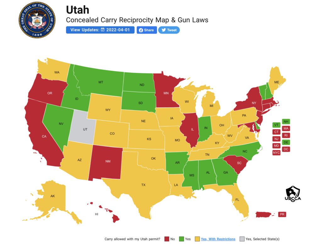 If you do not live in Delaware but want to carry a concealed deadly weapon in Delaware: most surrounding states do NOT have reciprocity with Delaware. This means that your Maryland, New Jersey, New York and Pennsylvania concealed carry or from any state that does not have reciprocity with Delaware) do not legally let you carry in the First State. You will need to get either a nonresident Delaware Concealed Carry Permit, or a permit from a state that does have reciprocity, the two most popular being Utah and Florida concealed carry permits. Further, there are numerous restrictions even with states that do technically have reciprocity, so be sure to check out the USCCA website which has all of this information. Here is the Delaware and Utah reciprocity maps from the USCCA website, which is a great resource for carry laws.