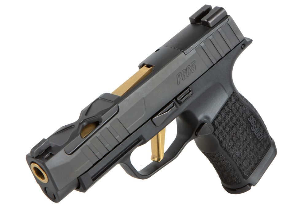 Designed on the P365 XL chassis, the Spectre comp also includes a stylish flat TiN gold trigger and Sig Custom Works badging, is optic ready, has an LXG laser engraved grip, and day/night iron sights.