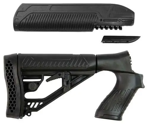 Optimized for pump shotguns, the advanced design features and high-impact, polymer construction of Adaptive Tactical’s EX Performance Adjustable Stock and Forend make it an ideal choice when upgrading your Mossberg 500 & 88 (see NOTE), 590 series 12 gauge pump shotgun. The EX Performance Forend features a 2″ Picatinny rail concealed under the nose cap. Uncovered, it is ideal for attaching tactical accessories such as lasers or lights. It is constructed of durable of high performance, lightweight polymer. The EX Performance M4-style stock with pistol grip features an easy-to-reach rapid adjust lever for custom length-of-pull, and includes an integrated QD swivel attachment and molded in non-rust standard sling swivel attachment. It features durable polymer construction with non-slip vented rubber recoil pad, oversized extra strength adjustment pin, and sleek industrial design.