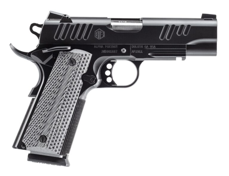 The AF1911 Enhanced 4.25 blends classic 1911 design with modern refinements in a versatile mid-size platform. Its 4.25″ barrel offers a perfect balance of accuracy, control and carry friendly handling. Finished in a Black QPQ coating; green dot bull ramped Novak sights front and rear and enhanced ergonomics.
