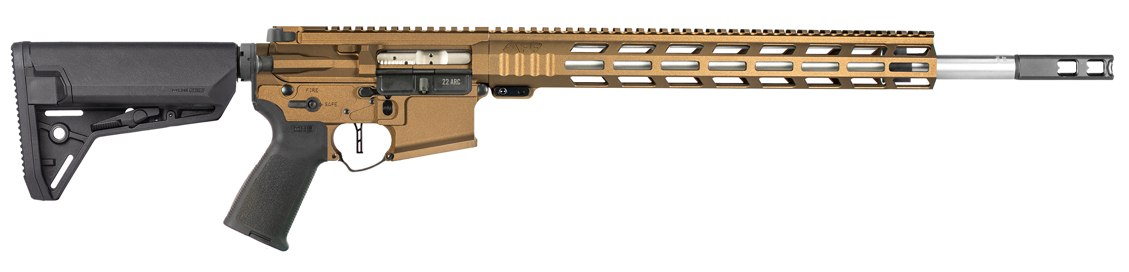 18 416 SST Barrel (1:7 Twist) – .750 Rifle-Length Gas System – Diamond-Honed Nitride M16 BCG (6.5 Grendel Bolt Face) – APF 3.5 lb. Drop-In Trigger – APF Adjustable Gas Block – APF Butcher-16 Muzzle Break – Magpul ACS Stock – Magpul MOE Grip – APF 15 M-Lok Handguard – Billet Receiver Set – Ambidextrous Controls – Caliber/ Gauge: 22 Arc – Barrel Length: 18 416 SST Barrel (1:7 Twist) – Action: Semi-Auto – Front Sight: Rear Sight: None – Color: Burnt Bronze – Finish: Cerakote – Material: Aluminum – Hand: Right