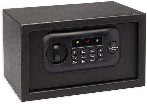 The Bulldog standard digital pistol vault has a 12 digit key pad for more secure combination options, secure hidden key override, pre-drilled mounting holes, soft bottom carpet, heavy duty steel construction, and a durable powder coated black matte finish.