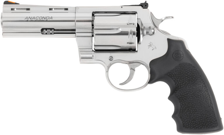 Shooter’s Model are 100% New in the Box products that may have a slight finish imperfection that is not covered by Colt’s one year warranty. The slight imperfection would occur during the manufacturing process and are typically very hard to see except to the well-trained eye or with a magnifier. – Colt’s popular Snake Gun revolver series gains a new addition with the updated Anaconda. The 2021 Anaconda has been fully re-designed to utilize an oversized Python action. Bulked-up with a solid stainless steel frame for strength and durability this DA revolver is worthy of its pedigree. – Experience the Linear Leaf Spring Action for a non-stacking smooth-as-glass trigger pull. With recoil-absorbing Hogue grips and adjustable interchangeable sights this .44 Magnum is cool and comfortable from the range to the woods. – A recessed target crown offers protection and the frame is drilled and tapped for optics mounts making the Anaconda an unstoppable huntsman’s sidearm. – Capacity: 6 Rounds – Frame Material: Stainless Steel – Finish: Semi-Bright – Barrel Technical: 1:20 LH 6 Groove – Barrel Length: 4.25 – Overall Length: 11.25 – Overall Height: 7.25 – Overall Width: 2.75 – Front Sight: Red Ramp – Rear Sight: Target Adjustable – Trigger Action: DA/SA – Grip: Hogue Overmolded – Unloaded Weight: 53 oz