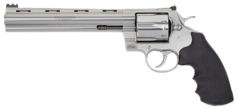 Shooter’s Model are 100% New in the Box products that may have a slight finish imperfection that is not covered by Colt’s one year warranty. The slight imperfection would occur during the manufacturing process and are typically very hard to see except to the well-trained eye or with a magnifier. – Introducing the Target Anaconda. With Hogue OverMolded rubber grips for enhanced handling and recoil absorption interchangeable with all Colt Python grips. Featuring a stainless steel frame with a polished finish and matte surface for easy sight acquisition. Its one-piece full lug vented rib stainless steel barrel includes a recessed target crown for pinpoint accuracy. Redesigned rear target sights are adjustable for elevation and windage with a simple Allen key complemented by a user-interchangeable green fiberoptic target front sight. Chambered for .44 Magnum caliber with a fluted 6-round cylinder.