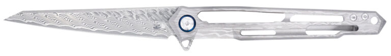 The Ghost frame lock knife is a masterful blend of artistry and functionality, designed for those who appreciate both beauty and performance in their everyday carry. This knife features a titanium handle with a cut-out design that not only reduces weight but also adds a distinctive aesthetic touch. The handle’s ergonomic design ensures a comfortable grip, making it ideal for extended use. The centerpiece of the Ghost is its Damascus Wharncliffe blade. Equipped with a smooth ball bearing pivot system, the Ghost ensures effortless blade deployment and secure locking, enhancing both safety and usability. The titanium clip allows for convenient, discreet carry, ensuring the knife is always accessible when needed. The Ghost frame lock knife combines sophisticated design with practical features such as a glass breaker and lanyard loop, making it an exquisite tool for collectors and a reliable companion for everyday use. Includes pocket clip.