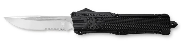 CobraTec Knives LBCTK1LDS CTK-1 Large 3.75″ OTF Drop Point Part Serrated D2 Steel Blade/ Black Aluminum Handle Features Glass Breaker Includes Pocket Clip