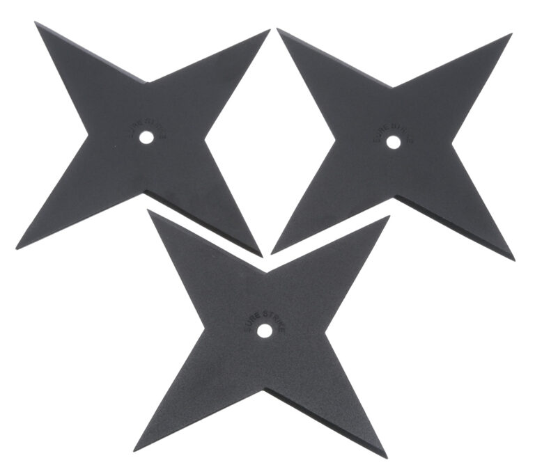The Sure Strike is our interpretation of the classic Shuriken or throwing star. Used for centuries in China and Japan, the throwing star consists of a well-balanced piece of flattened steel with 3 or more sharp points. When thrown overhand like a baseball, side arm, underarm or back hand like a flying saucer, it hits on at least one point every time. Our Sure Strikes aren’t like the cheap, shoddy throwing stars you see at flea markets, guns shows and in martial arts magazines. They are precision laser cut from high carbon steel and heat treated to a durable spring temper before sharpening. They are then treated with a black, baked-on epoxy finish to protect them from the rigors of the elements and repeated throwing.
