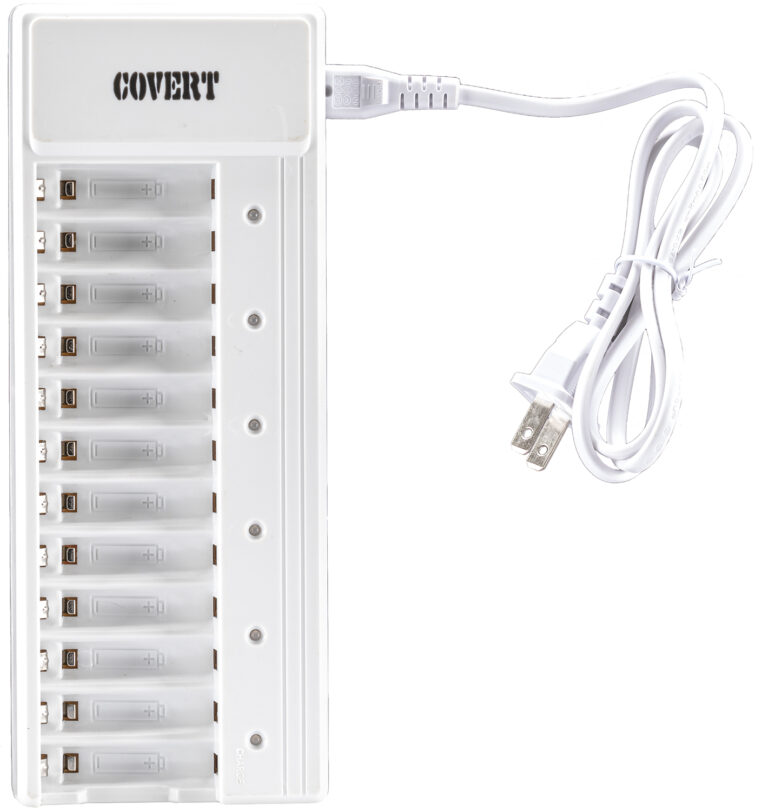 Don’t waste away money on new batteries. Coverts new battery charger charges up to 12 AA rechargeable batteries at a time and alerts when the battery is charged with a green light.