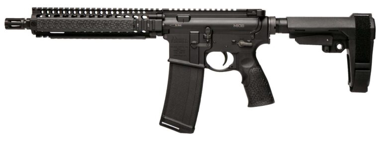 Daniel Defense’s MK18 Pistol is a variation of the MK18 SBR. It is equipped with a SB-Tactical SOB Pistol Stabilizing Brace and a Daniel Defense pistol grip with an integral trigger guard and soft touch overmolding. The direct impingement, carbine length, low profile gas block is CNC machined from 4140 hardened steel with a Mil-Spec heavy phosphate coating. Its 10.3″ barrel is constructed of chrome moly vanadium steel that is chrome lined with a heavy phosphate coating and a nitride finished flash suppressor. The Mil-Spec upper and lower receivers are CNC machined of 7075-T6 aluminum, with a hard coat anodized finish. The MK18 pistol’s handguard is also CNC machined from 6061-T6 aluminum, with a hard coat anodized finish and rail panels made from heat resistant Santoprene. This model has a black forend.