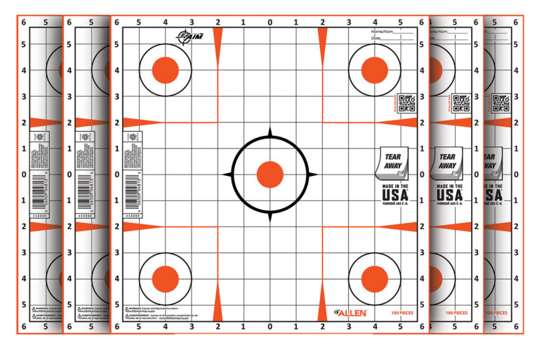The EZ Aim Sight Grid Target is a great all purpose target. The bound design is easy to handle and keeps targets looking great. It has five aiming points on a one-inch grid background. The grid background makes sight or scope adjusting easier. The target is 12″ x 12″. Two color print, Aiming points are one inch, bright orange color. Black gridlines and details. 100 targets per pack