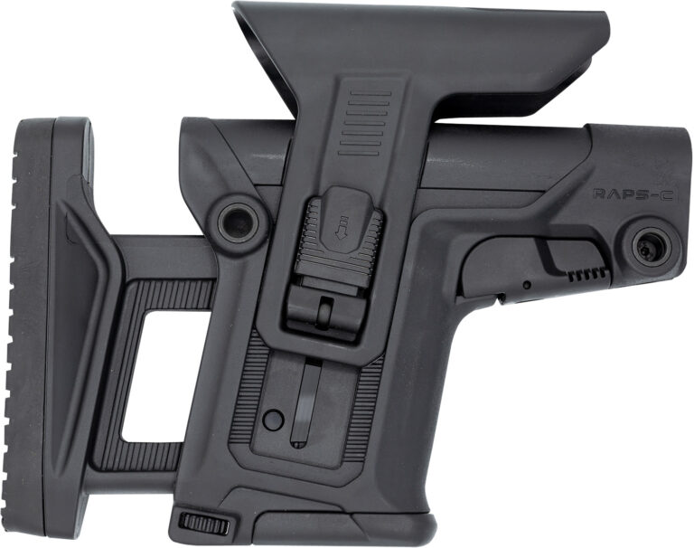 Integrated Cheek Rest & adjustable Length Of Pull (LOP). Patent-pending 1 Latch system, locks both LOP and Cheek Rest height with one lever; can be configured for right or left-hand shooters. LOP memory feature; set it once and the adjustable butt-pad will spring out to the same length every time. LOP Adjustment Range extension: 32mm (1.26). Integrated Cheek Rest, adjustment range; 42mm (1.65). Concealed Picatinny rail at the bottom of the stock for use with a monopod. Heavy-duty, rubber butt-pad with height adjustment. The RAPS-C includes a retention bolt, for determining optimal fit on MIL-Spec or Commercial-Spec Carbine buffer tubes. Easy installation, no gunsmith required