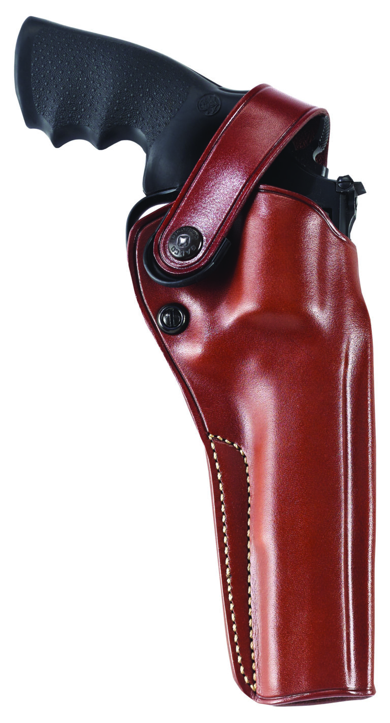 The DAO holster employs a retention strap for simplicity and security in the brush. Its retention strap has a large polymer tab, while the tension screw adjustments allow for a custom fit to your revolver. The DAO can be worn strong side or crossdraw and is constructed of steerhide and fits belts up to 1.75″ wide. Fits 6″ barrel N-Frame S&W 27/28 357, 29/629 357/44.