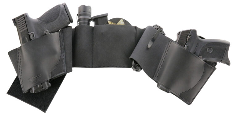 Galco’s traditional belly band allows concealed carry of multiple weapons and accessories around the midsection, in an infinite variety of configurations. The UnderWraps also enables the user to make instant additions and changes to the carry rig. Two leather holster pockets facilitate stable positioning of one or two firearms simultaneously, while two accessory pockets accommodate badge, cuffs, ammo, etc. The UnderWraps can be worn like a traditional belly band (low on the waistline, partially under the beltline or just above it) or it can be worn around the torso’s mid-section (around the solar plexus area). The UnderWraps accommodates both right and left hand draw, strongside, crossdraw and appendix carry, with butt-forward and barrel-forward cants.