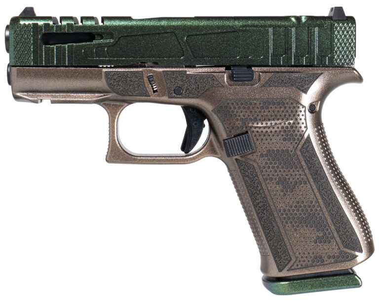 Introducing the Cypress Raptor for G43X MOS by Shark Coast Tactical available in three striking variations. Each version features a vibrant Gun Candy Cerakote finish with a green slide and flat dark earth frame. The standard package offers just the Cerakote finish perfect for a unique look. The enhanced package adds a custom cut slide for optics readiness and a stippled frame for improved grip. The premium package includes a custom cut slide stippled frame and a Zaffiri gold threaded barrel for adding a suppressor or compensator. Combining eye-catching aesthetics with exceptional performance the Cypress Raptor ensures your G43X MOS stands out. – Cypress Raptor (Cut Black Barrel) for G43X MOS
