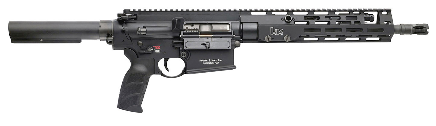 Suppressor-ready concentric 5/8 x 24 threads – Continuous picatinny rail interface between upper receiver and handguard – Extended ambidextrous charging handle with dual claws – Adjustable gas regulator for shooting suppressed and unsuppressed – Ambidextrous safety lever bolt release and magazine release – New HK USA enhanced ergonomic grip – M-LOK interface with integral ambi QD cups – Updated medium contour barrel profile – Ambidextrous QD end plate – Winter trigger guard – Match rifle cold-hammer-forged barrel – Caliber 7.62 x 51mm – Operating principle Gas operated short stroke piston – Bolt system Rotating bolt – Trigger system Two-stage trigger – Magazine capacity 10 / 20 round – Length (overall) 31.4 in / 798 mm – Barrel length 13 in / 330 mm – Height 7.75 in / 197 mm – Weight (empty magazine) 7.95 lb / 3606 g – Barrel thread pitch 5/8 x 24 – Safety Firing pin block trigger latch safety