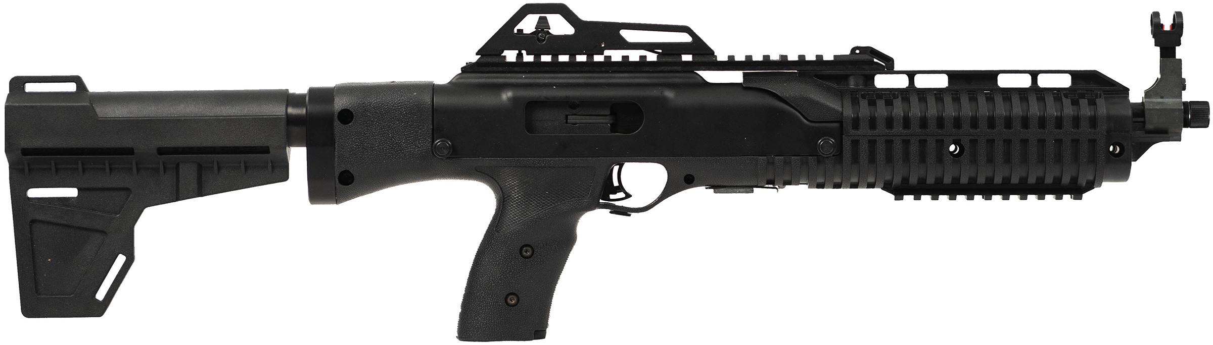 Hi-Point® Firearms 4595P Handgun Specifications – Barrel length: 14.25 Standard – Back Plate: Accepts standard buffer tube – Rear Rail: Picatinny rail insert – Weight: 6.5 LBS. – Capacity: 9-round mag standard – Overall length: 21.75 – Rear Sights: Ghost Ring Aperture – Finish: Black powder coat – Front Sights: HiViz light pipes fiber optics – All Hi-Point® Firearms 4595P handguns feature 100% American parts & assembly as well as: – Threaded .578 x 28 barrel standard – Thumb magazine release – Quick disconnect sling capability – Compatibility for various buffer tubes and folding braces – FREE trigger lock sling and swivels – 9-round magazine interchangeable with JHP45 & 4595 – Last round lock open – Picatinny rails at 12 & 6 o’clock – Fully adjustable sights (rear peep & post front) – Manual safety