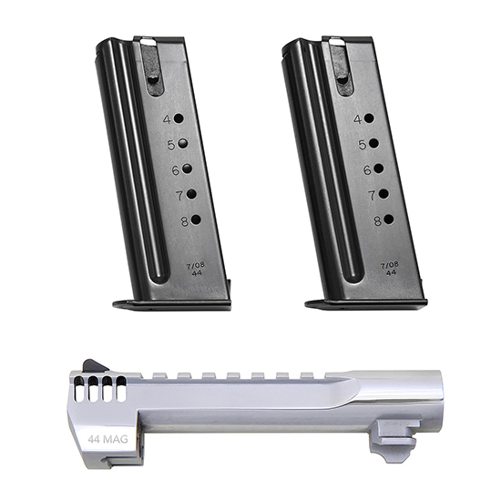 Convert your Mark XIX Desert Eagle .50AE to a .44 Magnum with this conversion kit! Conversion kit includes one Desert Eagle .44 Magnum 6 Polished Chrome Barrel w/ Integral Muzzle Brake and two 8 round Magazines