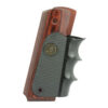 These are the American Legend grip panels for the Colt 1911. Rugged, dual-material grips combine the appearance and feel of real wood with the control and handling benefits of rubber combat grips. Smooth grip panels of attractive Pacwood, a rosewood laminate with a durable satin-finish, have neatly beveled bottom edges with cutouts for mainspring housing pin. The insert of semi-soft Decelerator(R) neoprene rubber has sharp diamonds molded in the side panels for superior gripping surface, wet or dry, that won’t bite into your hand. Deep, molded finger grooves on the frontstrap provide maximum control and comfort. For either right- or left-handed shooters, these grips will complement the finest accurizing job or combat alterations. Installation requires no alterations to gun.