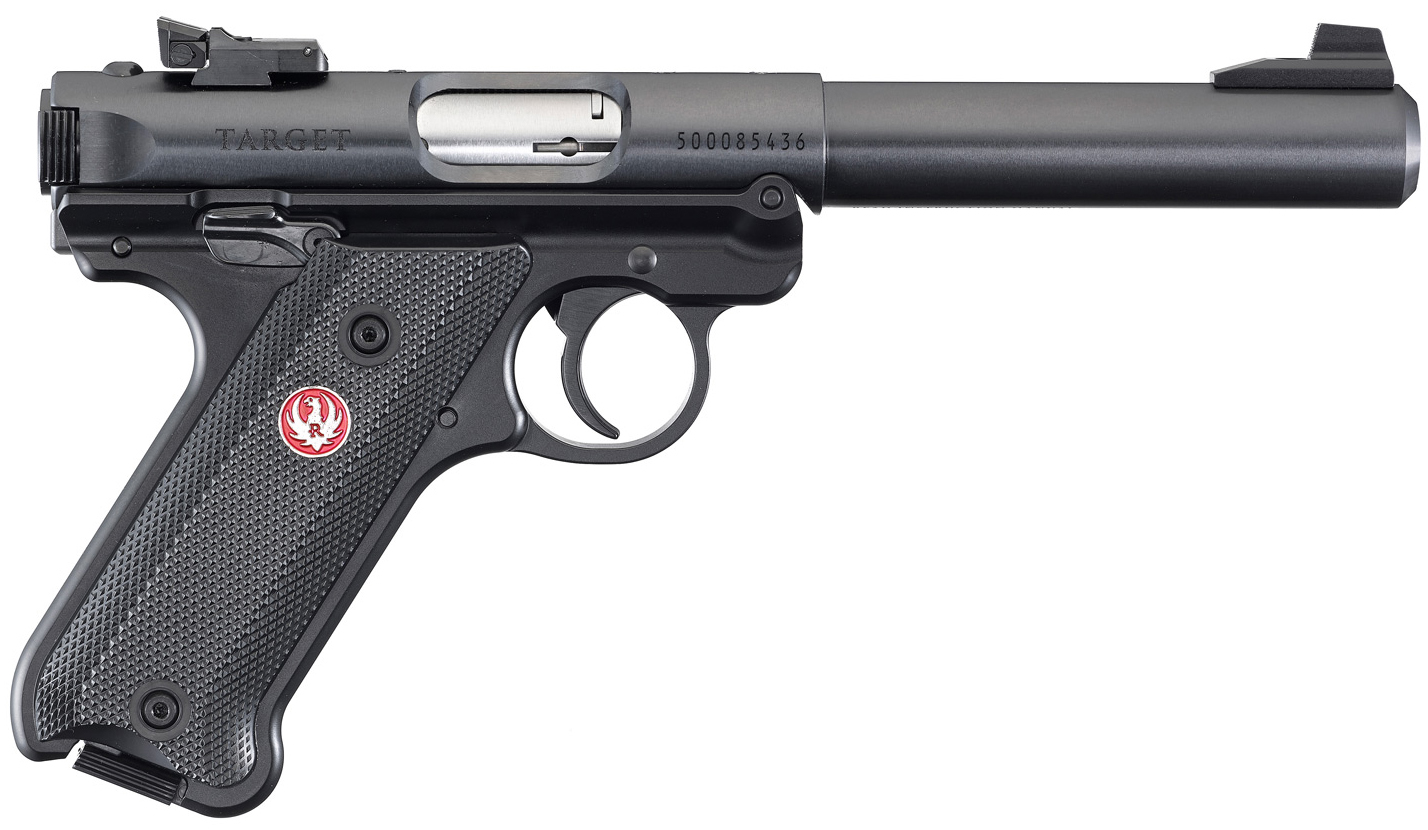 Caliber: 22 LR – Capacity: 10+1 – Material: Alloy Steel – Front Sight: Fixed – Barrel Length: 5.50 – Grip Frame: Aluminum – Grips: Checkered Synthetic – Finish: Blued – Width: 1.20 – Rear Sight: Adjustable – Barrel Style: Bull – Weight: 35.6 oz. – Overall Length: 9.75 – Height: 5.50 – Grooves: 6 – Twist: 1:16 RH – Available in CA: Yes – Simple one-button takedown for quick and easy field-stripping and proper chamber-to-muzzle cleaning. Pressing a button in the back of the frame allows the barrel-receiver assembly to tilt up and off the grip frame without the use of tools. – One-piece precision CNC-machined grip frame. – Cold hammer-forged barrel results in ultra-precise rifling that provides exceptional accuracy and longevity. – Ergonomic bolt stop. – Smoothly contoured comfortable grip features a natural pointing grip angle with replaceable grip panels for a non-slip hold. – Internal cylindrical bolt construction ensures permanent sight-to-barrel alignment and higher accuracy potential than conventional moving-slide designs. – Contoured ejection port and easy-to-grasp bolt ears allow for durable and reliable operation round after round. – Accurate sighting system features a drilled and tapped receiver for Weaver- or Picatinny-style rail for easy mounting of optics. – Ambidextrous manual safety can be converted to left-side only with included washer. – Features a conveniently located push-button magazine release on the left side of the frame. – Magazine drops free on release for convenient reloading. – Magazine disconnect prevents discharge when the magazine has been removed. – Also includes: two 10-round magazines.