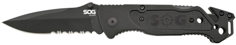 The Escape is the perfect size folding knife for everyday carry but still has a tremendous amount of capability with its one hand-opening blade. Integrated in the handle is a line cutter (perfect for cutting cord, string, seat belts, etc.), a glass breaker for extreme emergencies, our patent-pending wire stripper and extra line cutter blades (which are stored under the handle slab). All this combined with a stout partially serrated spear point blade and hard anodized aluminum handle, says I’m ready for whatever might come my way.