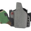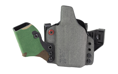 An ergonomic, mission-adjustable, RDS-compatible, multi-positional, deep concealment IWB hybrid thermoplastic holster. Its distinctive features enable concealed carry for a wide range of handgun fits from various carry positions while allowing a full firing grip prior to drawing. The design includes passive retention and adjustable tension, enabling a finely tuned fit and smooth draw. This evolution of the IncogX features a series of clips that provide more adaptability to the user while maintaining the original goals of improved grip, concealment, and function. The clips open outward and slide down with the holster, naturally locking over the belt. An actuated finger tab flexes to open, allowing quick installation or removal from the belt. An improved clip strut design combines functionality with customized concealment shims that can be easily installed or removed without tools. All IncogX models come with clip strut shims in three different concealment sizes: 1/8″, 1/4″, and 3/8″.