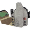 An ergonomic, mission-adjustable, RDS-compatible, multi-positional, deep concealment IWB hybrid thermoplastic holster. Its distinctive features enable concealed carry for a wide range of handgun fits from various carry positions while allowing a full firing grip prior to drawing. The design includes passive retention and adjustable tension, enabling a finely tuned fit and smooth draw. This evolution of the IncogX features a series of clips that provide more adaptability to the user while maintaining the original goals of improved grip, concealment, and function. The clips open outward and slide down with the holster, naturally locking over the belt. An actuated finger tab flexes to open, allowing quick installation or removal from the belt. An improved clip strut design combines functionality with customized concealment shims that can be easily installed or removed without tools. All IncogX models come with clip strut shims in three different concealment sizes: 1/8″, 1/4″, and 3/8″.