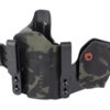 An ergonomic, mission-adjustable, RDS-compatible, multi-positional, deep concealment IWB hybrid thermoplastic holster. Its distinctive features enable concealed carry for a wide range of handgun fits from various carry positions while allowing a full firing grip prior to drawing. The design includes passive retention and adjustable tension, enabling a finely tuned fit and smooth draw. This evolution of the IncogX features a series of clips that provide more adaptability to the user while maintaining the original goals of improved grip, concealment, and function. The clips open outward and slide down with the holster, naturally locking over the belt. An actuated finger tab flexes to open, allowing quick installation or removal from the belt. An improved clip strut design combines functionality with customized concealment shims that can be easily installed or removed without tools. All IncogX models come with clip strut shims in three different concealment sizes: 1/8″, 1/4″, and 3/8″.