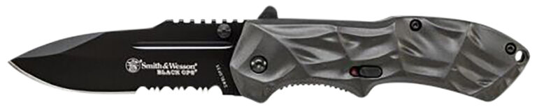The Smith & Wesson Black Ops M.A.G.I.C. Assisted Opening Liner Lock Folding Knife is made of a black stainless-steel tanto point blade with ambidextrous thumb knobs and jimping. Its blood groove, ergonomic rippled and smooth handle come with a safety lock, lanyard hole and pocket clip.