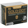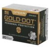 Gold Dot was the first handgun ammunition loaded with true, bonded-core bullets. Using an exclusive Uni-Cor(R) method, Speer bonds the jacket to the core one molecule at a time at the very beginning of the bullet construction process. This virtually eliminates core-jacket separation. With options for both standard handguns and short barrels, there’s a Gold Dot load to fit any shooter. Each Gold Dot hollow point cavity is tuned by specific caliber and bullet weight to ensure optimum performance. Speer forms the hollow point cavity in two stages. The first establishes how far the bullet can expand; the second controls the rate of expansion. This patented two-step cavity formation gives Speer engineers incredible control in the design process. Each bullet caliber and weight is tuned for optimum expansion and penetration. The bullet is then finished to provide a smooth profile for reliable feeding in semi-automatic handguns. To ensure Gold Dot performs when you need it most, they first make sure it excels in the stringent tests developed by the Federal Bureau of Investigation for service-class handgun cartridges. These protocol tests evaluate penetration, expansion and retained weight in bare gelatin and gelatin shielded by common barriers.