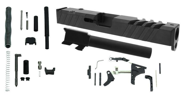 (1) Stripped Glock 17 compatible RMR cut slide w/cover plate (1) Glock 17 compatible 9mm barrel (1) Glock 17 upper parts kit (1) Glock 17 lower parts kit