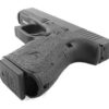 Talon Grips for Gen 4 Glock 19, 23, 25, 32, and 38 models with No Backstrap installed. This rear wrap grip is in the rubber texture. This grip provides full coverage on the side panels including above the thumb rest, ample coverage on the backstrap, and three finger wraps for the finger groves under the trigger guard. This grip has a logo cutout for the Glock emblem on the left side. This grip sticks extremely well even with the Rough Textured Frame (RTF). Talon Grips are 100% Made in the USA. Adhesive material is less than 0.5mm thick.