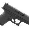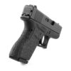 Talon Grips for Glock 43. This rear wrap grip is in the rubber texture. This grip has full coverage on the side panels including above the thumb rest, high coverage on the backstrap, and full coverage under the trigger guard. This grip include a graphic cutout for the Glock emblem on the shooter’s left and the Talon T on the shooter’s right as well as relief cuts for the thumb rest on each side. Talon Grips are 100% Made in the USA. Adhesive material is less than 0.5mm thick.