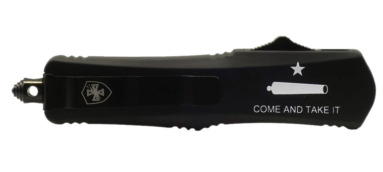 Templar Knife LCATII531 Gen II Come And Take It Small 2.69″ OTF Tanto Part Serrated Black Oxide 440C SS Blade, 4.31″ Black “Come And Take It” w/Cannon Aluminum Handle, Glass Breaker