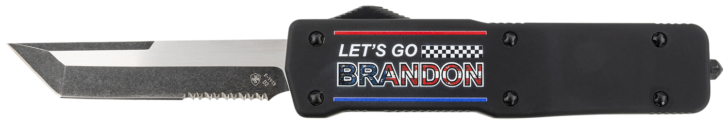 Templar Knife LZLGB521 Premium Weighted Let’s Go Brandon Large 3.55″ OTF Tanto Part Serrated Black Oxide Stonewashed D2 Steel Blade, 5.25″ Black “Lets Go Brandon” Aluminum Zinc Alloy Handle
