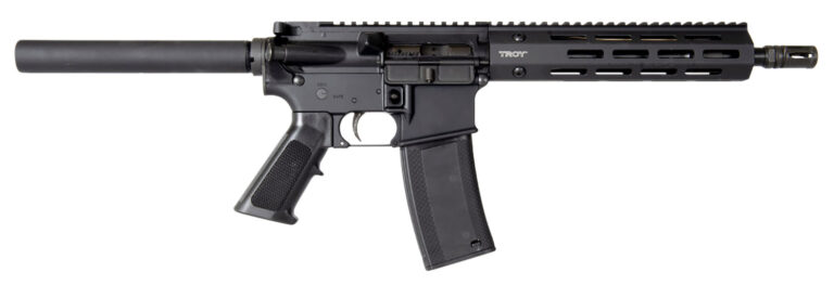 The TROY A3 pistol is lightweight and has an ultra-low profile. It features a standard safety selector, standard trigger flat trigger guard, and a BattleRail forend. The barrel has an A2 flash hider and 1:7 twist rate. The pistol also features aluminum receivers, LFT handstop, and is optic ready.