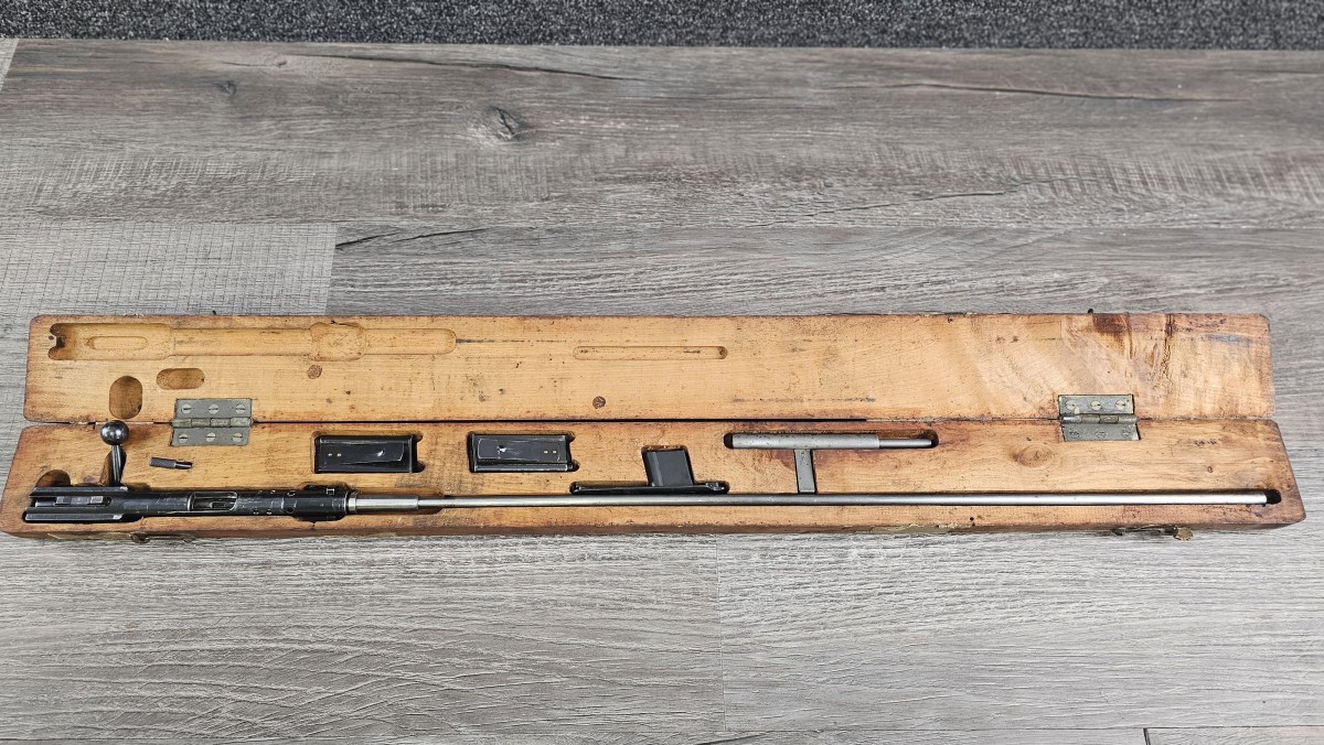 The WWII ERMA ERFURT K98 .22 Caliber Conversion Kit is an original, authentic piece of militaria from Germany, dating back to World War II. This kit, designed for conversion of the K98 rifle to .22 caliber, was produced in Germany during the war. With its historical significance and connection to the conflict, this item holds value for collectors and enthusiasts of World War II weaponry.
