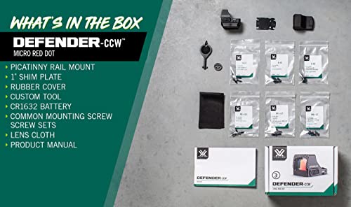Includes:1° Shim Plate, Picatinny Rail Mount, Rubber Cover, Lens Cloth, CR1632 Battery, Tool, Most Common Mounting Screw Screw Sets