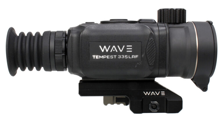 The Wave Tempest Laser Range Finding scope features a base magnification of 3x with up to 12x zoom with two options- rapid and smooth; OLED display with four hue options- gray, blue, purple and red; hot tracking; outline mode; 8 reticle and a “no reticle” option; 5 reticle colors- black, blue, green, red and white; reticle center dot illuminated with three color options-blue, green, red; auto shutdown; front or second focal plane options and ballistic calculation.