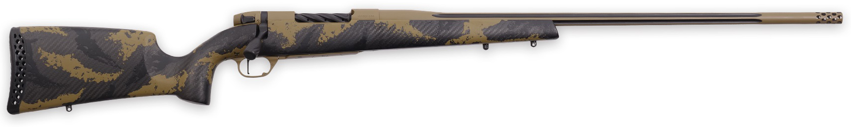 Welcome to the top of the food chain the Mark V® APEX is where long-range accuracy meets lightweight hunting. The APEX is built on the iconic Weatherby® Mark V® steel action and comes with a fluted two-toned cerakoted barrel. – FINISH – Fluted Barrel- 2-tone Coyote Tan Cerakote and Graphite Black – Trigger Guard / Receiver- Coyote Tan Cerakote – Bolt / Bolt Knob / Safety- Graphite Black Cerakote – Stock- Exposed Carbon fiber with tan/brown sponge pattern accents