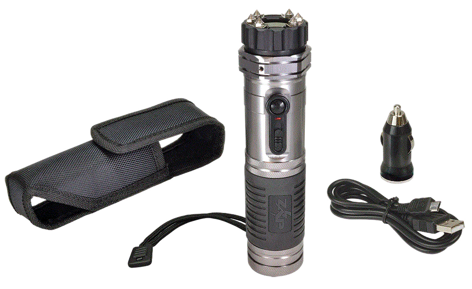 Walk with confidence with this ultra-bright flashlight/stun gun combo. The Zap Light has 1 million Volts and is perfect for camping, hunting and dark parking lots. It lasts up two months when fully charged. Ni-MH rechargeable battery, 6 ultra-bright LED bulbs, and a 120V/60Hz wall charger. The Zap Light includes a wrist strap for added security, a heavy nylon case with belt clip, USB wall charger and USB car charger.